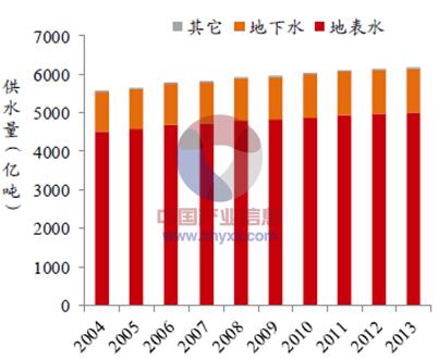 对比可知,用水量和供水量基本平衡。用水量最大的是农业,但其基本无需给水处理;其次是对水处理要求较高的生活用水,以及要求更高的工业用水,这两部分是供水行业的核心组成部分。从各组分来看,各用水方向的比例构成较为稳定,工业用水量和生活用水量均有小幅增长,2013年较2004年分别增长15%和18%。